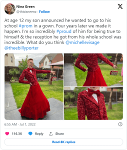 Accompanied by a few photos of Korben donning the stunning outfit, Green wrote, “At 12, my son expressed his wish to attend his school prom in a gown. Four years later, we made it happen. I’m incredibly proud of him for staying true to himself, and the reception he received from his entire school was amazing.”